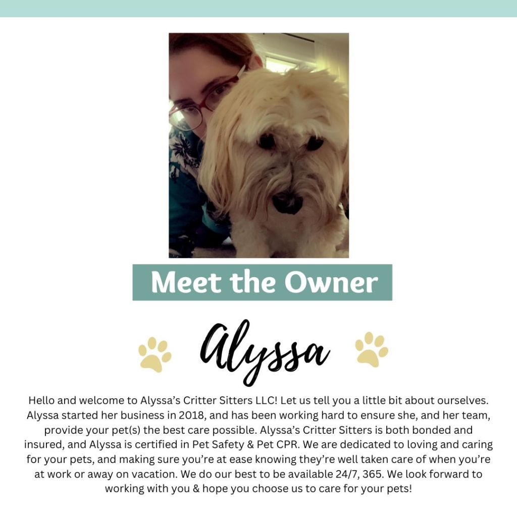 “Alyssa’s Critter Sitters is the absolute best! My go-to for my dog sitting needs. Alyssa has been pet sitting for me for years. Anytime I’m out of town, she pet sits my fur baby, Duncan. He absolutely loves her. She’s amazing! I have such anxiety being away from my dog, but Alyssa sets me at ease. I always know that he is well taken care of. The best in the business! “