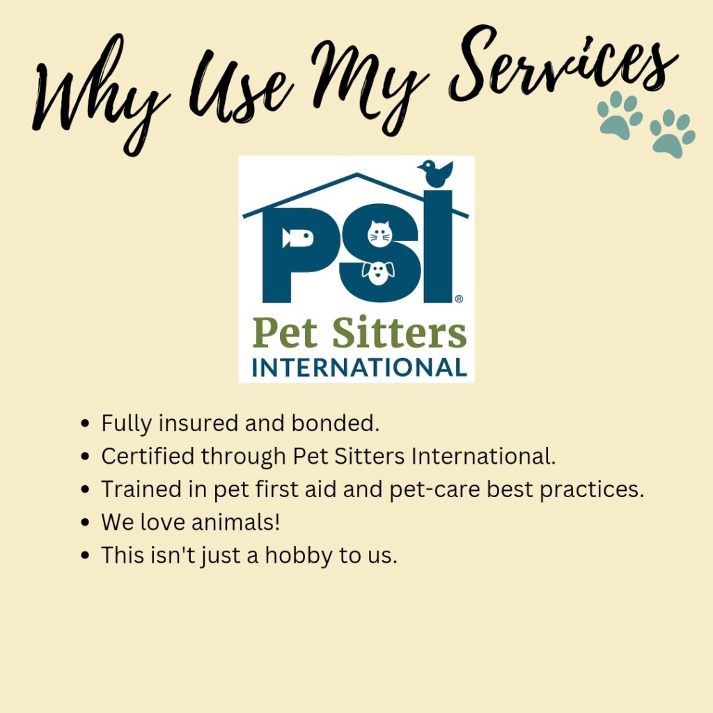 For when you take your pets with you on vacation- We will come to your house to bring in your mail, turn on and off lights, water plants, bring in packages, still make the house look lived in while you’re away. - Accident Fee is $10/per accident that needs cleaning